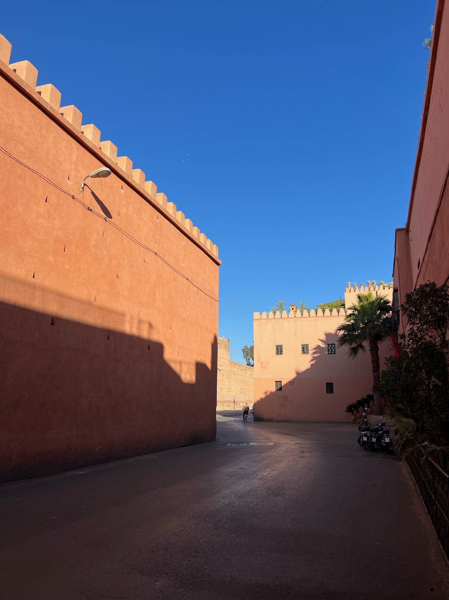 Los gehts in der Derb Ahl Souss vom Riyad Terese: rechts, rechts, links, rechts, vorbei an Aziz Tante Emma Laden, rechts in die Rue Berrima vorbei am Parkplatz, an der Moschee. Die Palastmauern des El Badi säumen den Weg in Richtung Place de Ferblantiers.
